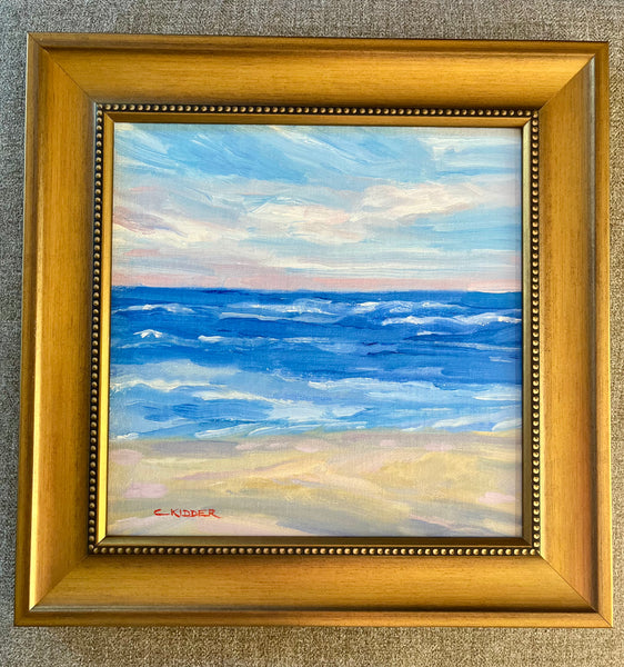 Pink Horizon 10x10 Oil painting of Crane Beach in Ipswich,Ma. on a windy day. Atlantic blues with a slice of pink on the horizon.