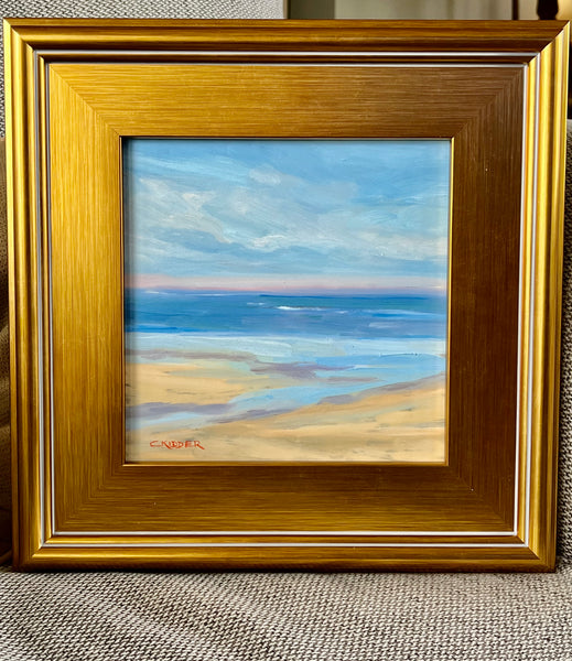 8x8 Oil painting of the tide coming in at Crane Beach in Ipswich. The sky is pink on the horizon and the water a deep Atlantic blue creating a calm and soothing atmosphere.